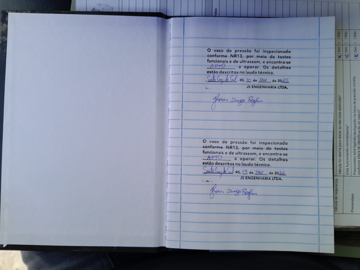 Laudo de vasos de pressão (compressores) realizados conforme determina NR13 e tem como objetivo condicionar inspeção de segurança e operação dos vasos de pressão.